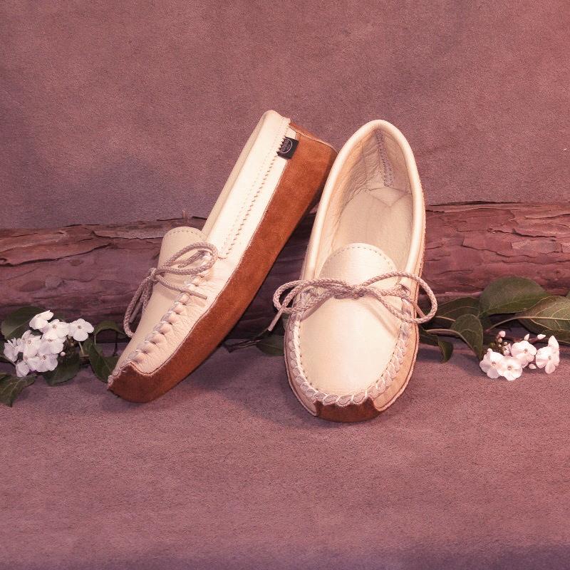 Our Women's Canoe Sole Moccasins are available in either double layer deertan or deerskin, as well as soft, thick cowhide. Leather canoe soles wrap around the toe and heel of this style. These moccasins are constructed with Poron® cushion insoles between the leather layers for complete leather interiors. A note on color: Creme is a difficult color to capture in a photograph. Our current deertan creme color is a beige-creme.